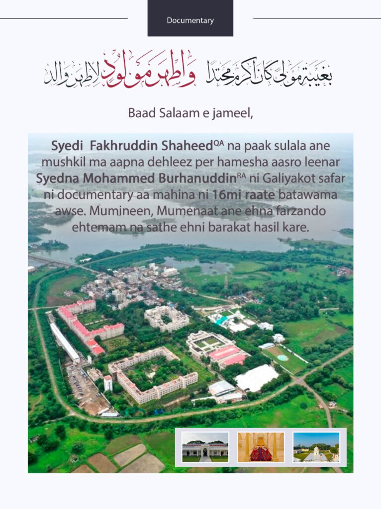 Aaje 16mi raat ni Darees anne Documentary nu live relay Marol Saifee Masjid si Magrib / Isha Namaaz baad foran thaase.
