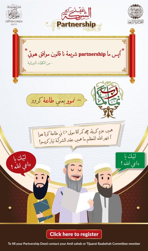 Ye sagla Mumineen aa Shehrullah il Moazzam na dino ni ganeemat leta huwa potani Aqd-us-shirkat- Partnership Deed bhare ane Aqa Maula tus ni Dua Mubarak hasil kare.