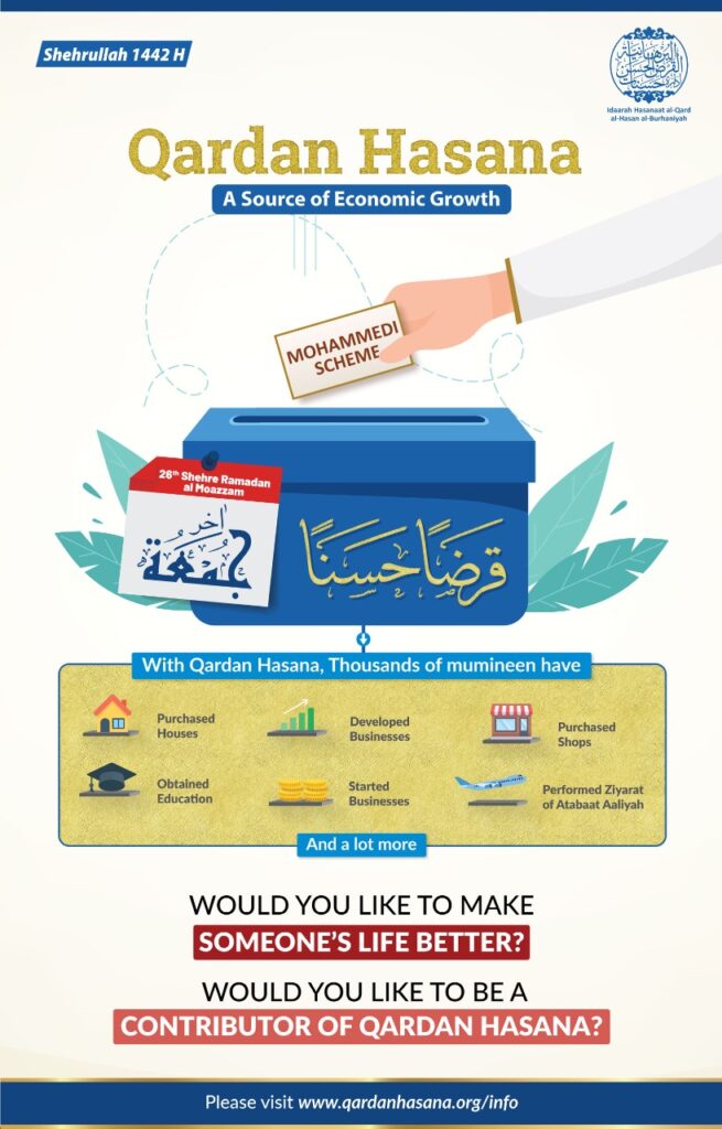 Sagla mumineen Qardan Hasana – Mohammedi Scheme ma potana gharo ma shaamil thaai, ane imkaan thai tey waqt, Qardan Hasana Committee na nazdeek raqam jama’ kare.